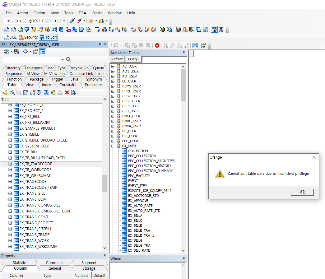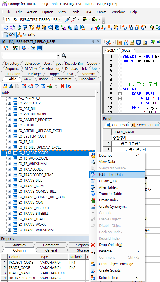 orange for tibero7의 edit table data 메뉴에서 오류가 발생합니다.